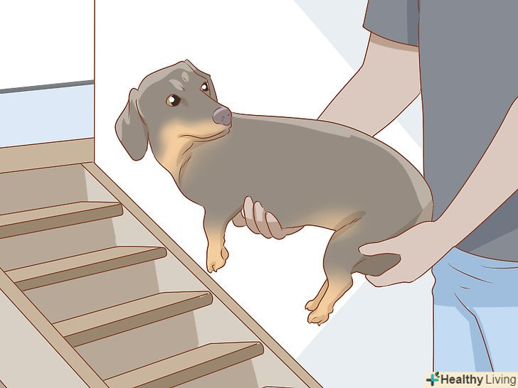 Допомагайте таксі долати сходинки. бігання по сходах надає додатковий тиск на спину такси, що з часом може привести до розвитку дископатії. Звичайні сходи мають занадто високі для такс сходинки, щоб вони могли підніматися і спускатися по них без зайвого стресу для спини. Щоб уникнути даної проблеми, завжди носите таксу через сходинки на руках, коли вам потрібно по ним пройти. [3]- Встановіть будинку біля сходів на другий поверх дитячу хвіртку, щоб такса не бігала по сходах.