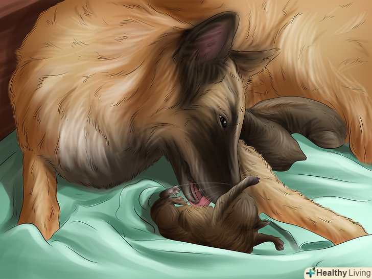 Переконайтеся в тому, що собака вичищає і вилизує цуценят відразу після появи на світ. Собака повинна вичистити щенят відразу ж після народження. Дайте їй близько однієї-двох хвилин, щоб вона звільнила цуценя від плодового міхура і почала вилизувати його. Якщо у собаки йде на це більше часу, можна втрутитися, самостійно зняти зі цуценя плодовий міхур і активно розтерти, щоб витерти його і простимулювати дихання. [4]- При необхідності можна обережно перев'язати пуповину в 2,5 см від живота цуценя і обрізати її чистими ножицями.