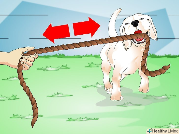 Грайте з мотузками. якщо ви хочете пограти в перетягування каната з собакою, покажіть їй мотузку і дайте вихованцеві схопитися за неї зубами. Візьміть інший кінець і потягніть мотузку, але не надто сильно, щоб не пошкодити зуби собаки. В кінці гри дозвольте собаці вирвати мотузку у вас з рук і обдаруєте її схвальним поглядом. [6]- Під час такої гри гарчання природно і не є ознакою ворожості.