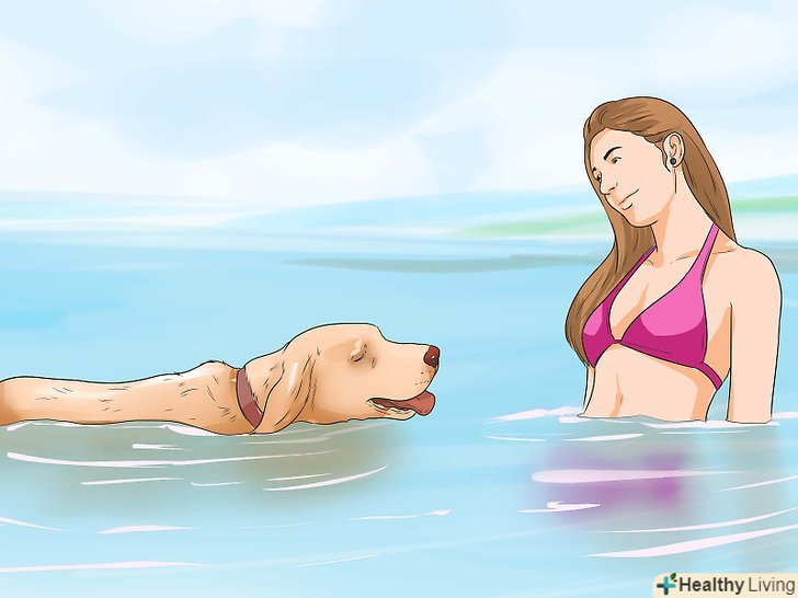 Плавайте з собакою. якщо хочете дати собаці інше навантаження, спробуйте плавання. Цей вид навантаження підходить собакам з тугорухливістю суглобів, оскільки при плаванні працює більше м'язів, і всі суглоби рухаються. Плавання краще ходьби, оскільки суглобам не доводиться утримувати всю вагу собаки. Плавайте разом з вихованцем — це дозволить вам зблизитися.- Не всі собаки добре плавають. Ваш улюбленець може запанікувати і потонути. Крім того, це не дуже гігієнічне заняття. По можливості відвідуйте спеціальні заняття гідротерапії, які проводяться в присутності ветеринара. Собака плаває в басейні на спеціальному повідку і не може потонути.