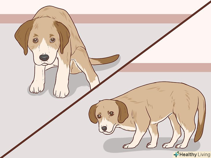 - Налякана собака також може зіщулюватися і припадати до землі. Якщо собака злегка притискається до підлоги, це може бути виразом готовності підпорядкування або нервозності. Про це також може говорити вигнута спина, злегка зігнуті лапи і опущений (але не піджатий) хвіст. Собака також буде дивитися на те, що її турбує. [16]