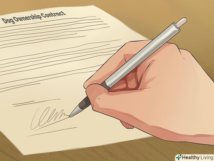 Підпишіть договір з новим власником. узгодьте умови передачі. Підпишіть договір самі і дайте його на підпис новому власнику. Серед умов можна вказати належне харчування, тренування та ветеринарну допомогу. У контракті також можна вказати, що новий власник повинен зв'язатися з вами, якщо в майбутньому він вирішить віддати собаку. [4]