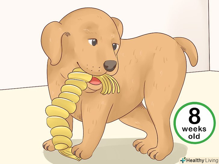 Щеня все гризе і починає цікавитися іграми. у міру того як щеня росте, він стає більш активним. На восьмому тижні цуценята починають демонструвати типову» щенячу " поведінку: у них ріжуться зуби, тому вони все гризуть. Крім того, вони починають активно вивчати навколишнє оточення і грати. [11]- У період прорізування зубів щеня може скиглити і вести себе неспокійно.