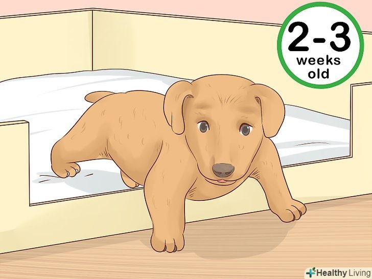Чи почав щеня ходити? зверніть увагу на те, чи почав щеня ходити. Цуценята відкривають очі приблизно на другому-третьому тижні життя. Тоді ж вони роблять перші спроби вибратися з гнізда і почати ходити. Вони починають цікавитися навколишнім світом і досліджувати його. Це характерна поведінка п'яти-шеститижневих цуценят. [9]