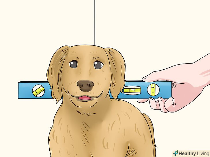 Прикладіть рівень до холки перпендикулярно тілу собаки і поставте на стіні мітку. приставте рівень до холки собаки таким чином, щоб один його кінець торкався стіни. Переконайтеся в тому, що рівень розташований строго горизонтально, а потім відзначте для себе на стіні нижню точку дотику рівня зі стіною. Так ви завдасте позначку зростання собаки на стіну. [3]- Якщо ви не маєте нічого проти невеликої позначки на стіні, можна скористатися простим олівцем і дійсно поставити мітку. Ну а якщо ви не хочете псувати стіну, можна просто прикласти палець до стіни у відповідній точці або ж відзначити її шматочком малярного скотча.