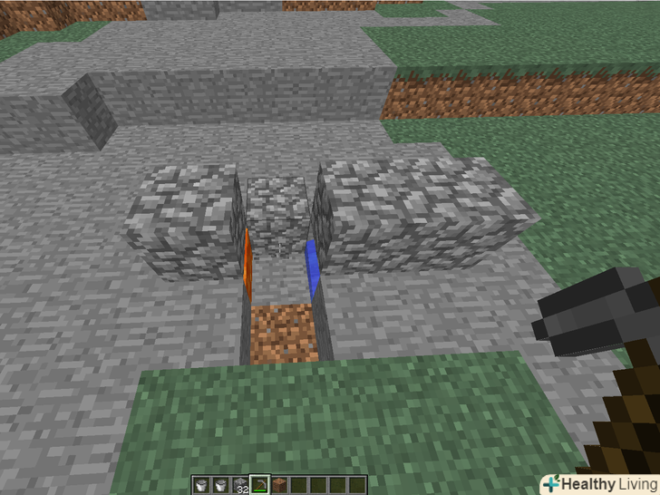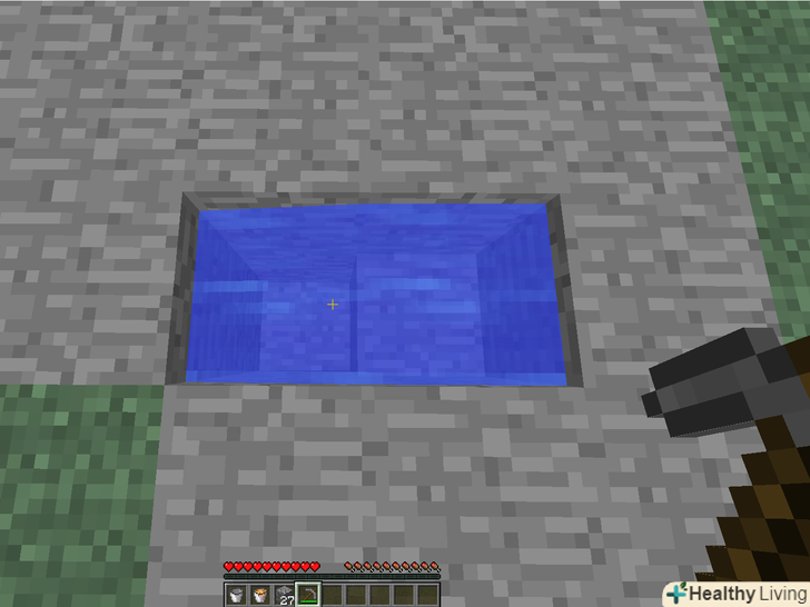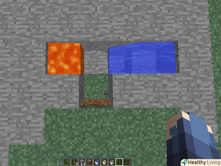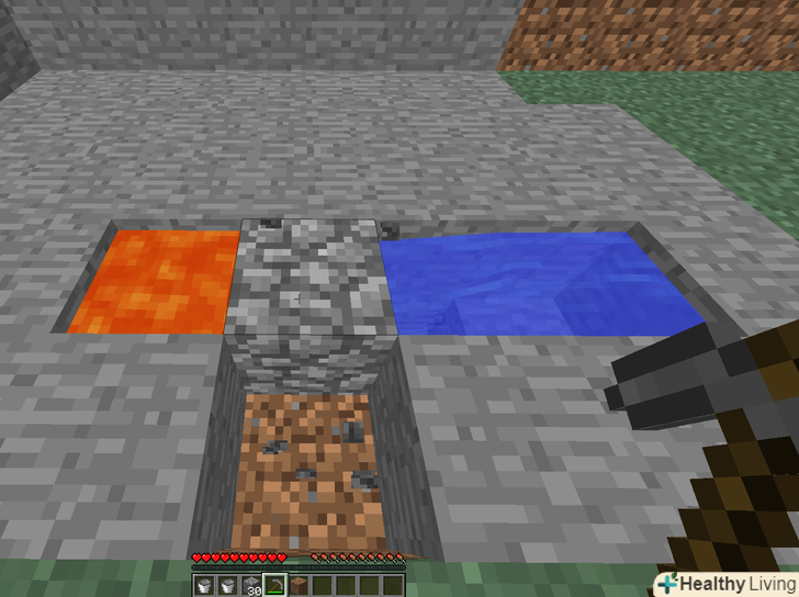 Викопайте яму глибиною в один блок, а поруч викопайте ще одну яму глибиною в два блоки.заповніть водою яму глибиною в один блок, щоб вода могла текти в яму глибиною в два блоки.- Якщо вода перетворює лаву в обсидіан, ймовірно, ви не вирили другу яму глибиною в два блоки.