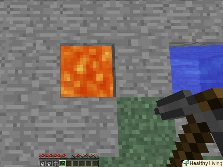 Зберіть необхідні предмети.вам знадобляться три залізні злитки, щоб скрафтити відро, джерело лави і джерело води. Здобудьте залізо під землею або шукайте його на стінах печери. Розплавте залізо в печі, а потім скрафтіть відро. Лава іноді зустрічається на поверхні, але щоб знайти її в надлишку, підіть під землю нижче координати Y:9.- Створіть два відра, якщо хочете нести лаву і воду одночасно.
