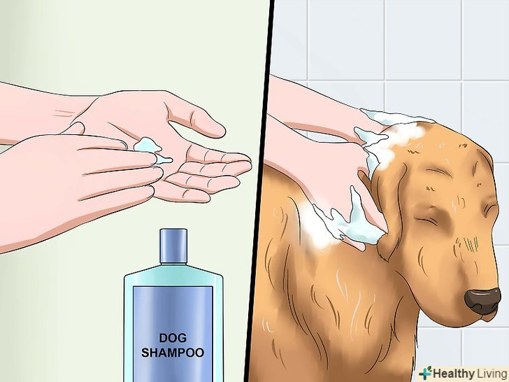 Перш ніж наносити шампунь на шерсть собаки, намильте їм свої руки. раптове відчуття шампуню на шерсті може налякати собаку, і вона спробує вирватися. Щоб уникнути цього, видавіть шампунь на руки і потріть їх одна об іншу, і лише потім розітріть шампунь по шерсті тварини. [12]