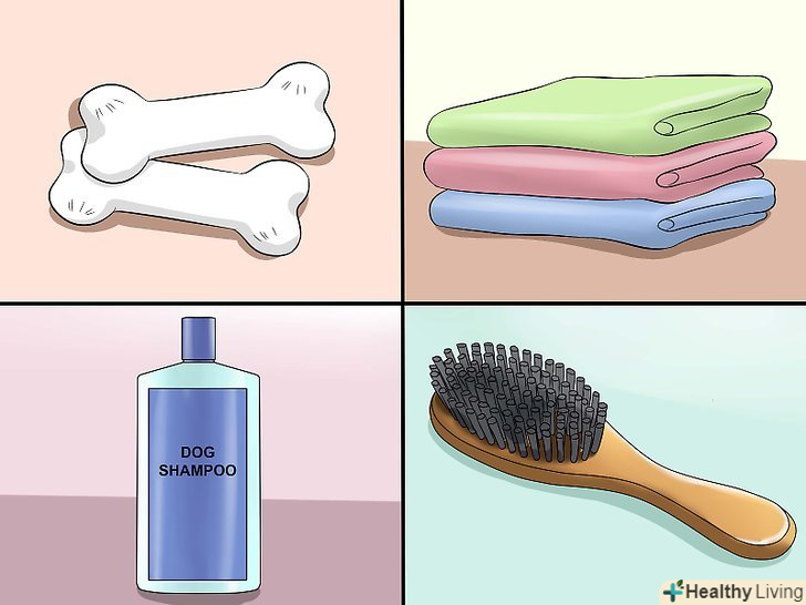 Перш ніж приступити до купання, занесіть у ванну все необхідне. у вас повинно бути під рукою все, що може знадобитися в процесі купання. Якщо ви помістите собаку в ванну, а потім відлучитеся за шампунем, вона може втекти. Крім того, тварина може сприйняти це як гру і погнатися за вами. Запасіться всім необхідним, перш ніж завести собаку у ванну кімнату. [2]- Вам знадобиться трохи ласощі, рушники, шампунь, щітка і губка. Можливо, варто використовувати гіпоалергенний або м'який шампунь з кондиціонером. Якщо ви побоюєтеся, що шампунь потрапить тварині в очі, подумайте про те, щоб використовувати шампунь "без сліз".