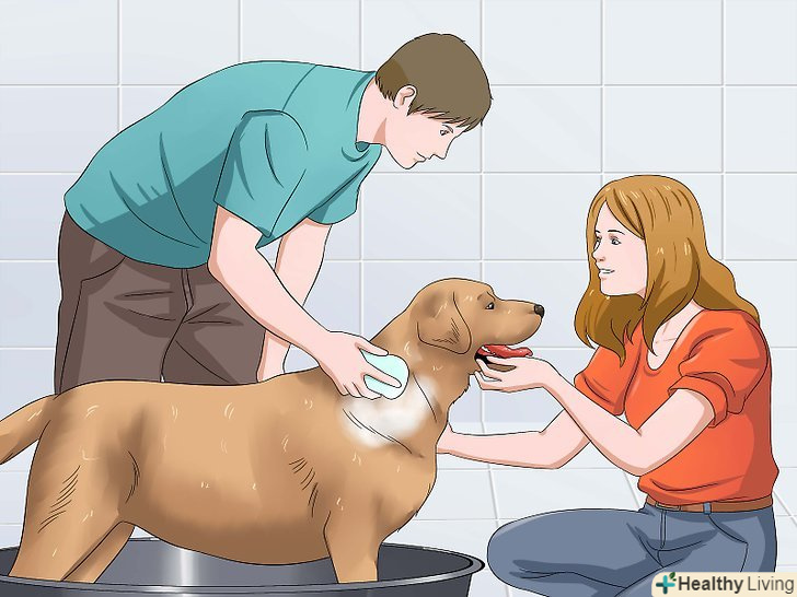 Попросіть когось допомогти вам. якщо можна, заручіться чиєюсь підтримкою. Ваш помічник зможе тримати тварину і відволікати його під час купання. Крім того, він запропонує собаці ласощі в процесі купання або після нього, і вам не доведеться відволікатися від миття тварини, через що воно може вислизнути і втекти. [4]