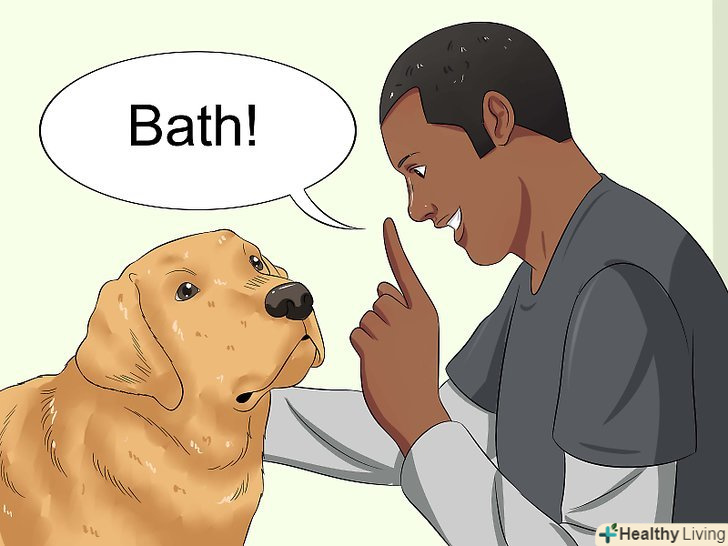 Привчіть свого вихованця до певного сигналу, який давав би зрозуміти про те, що прийшов час купатися. якщо ви мовчки візьмете собаку і віднесете її в ванну, це може викликати у неї шок, і вона постарається вирватися і втекти. Замість цього подайте тварині сигнал за допомогою характерного слова або фрази. Якщо собака вже знайома з даними сигналом, це допоможе їй заспокоїтися. Можна використовувати слово" митися "або"купатися". Повторюйте вибране слово кілька разів перед першими купаннями свого вихованця. З часом собака почне розрізняти його і буде знати, що воно пов'язане з купанням. В результаті водні процедури не будуть несподіваними, і тварина стане спокійніше ставитися до них. [6]