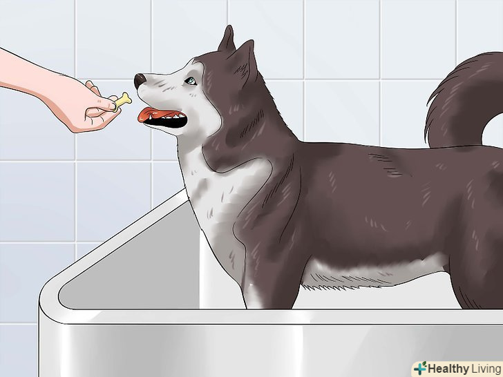 Якщо собака проявляє занепокоєння, ще раз почастуєте її чимось смачненьким. Тримайте ласощі під рукою, щоб з його допомогою заспокоїти тварину, як тільки воно почне хвилюватися. Покладіть ласощі так, щоб ви могли дотягнутися до нього, або попросіть свого помічника взяти це на себе. Оскільки ви купаєте свого вихованця далеко не кожен день, можна побалувати його ласощами більше, ніж в інші дні.
