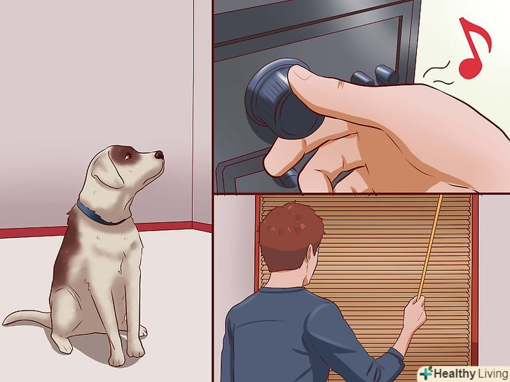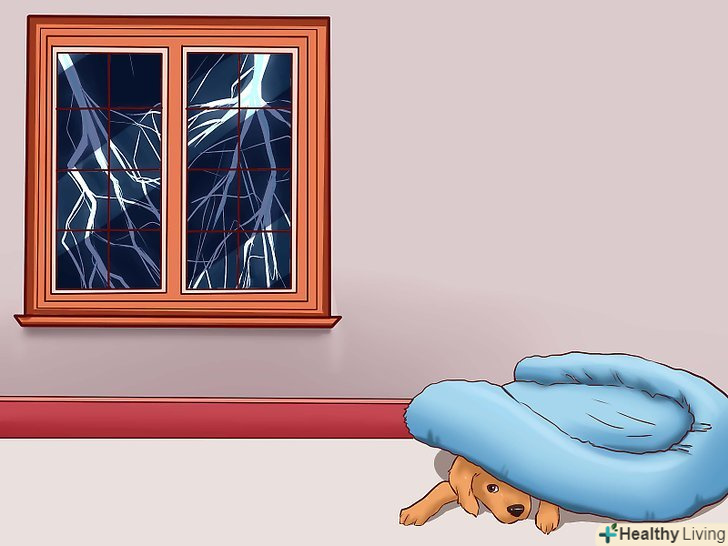 Зведіть до мінімуму контакт з джерелом тривожності. якщо собаку змушує хвилюватися конкретна людина, відведіть її в іншу кімнату. Якщо вихованця лякають гуркіт грому або гуркіт салюту, закрийте штори і включіть музику, щоб замаскувати ці звуки. Якщо собака прагне притиснути хвіст і сховатися в безпечному місці, можливо, у власній клітці, накрийте клітку легким ковдрою, щоб допомогти приглушити лякаючі звуки. Знову ж таки,Обраний метод заспокоєння залежить від того, чого саме боїться ваша собака.[3]- Можна створити для собаки безпечний простір, просто відкривши двері в ту кімнату, яка знаходиться далеко від гучних звуків, або привчивши вихованця до клітки. В останньому випадку собака стане ставитися до власної клітці як до самого заспокійливого місця з усіх можливих. [4]