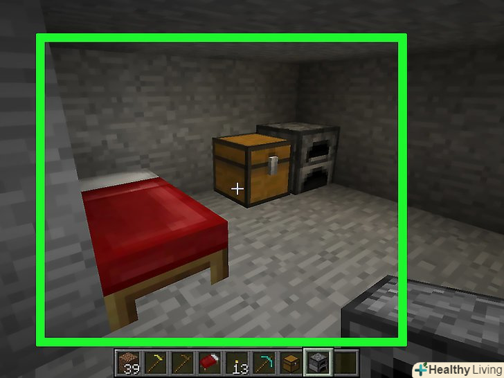 Створіть базу.для цього викопайте приміщення розміром 3х5х5 блоків( як мінімум), створіть дверний отвір і поставте на створеному майданчику свої предмети (наприклад, факели, ліжко, піч і скрині).