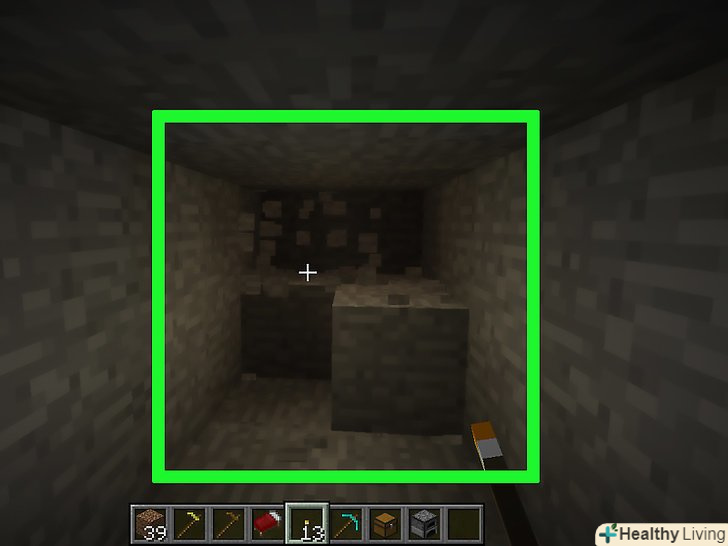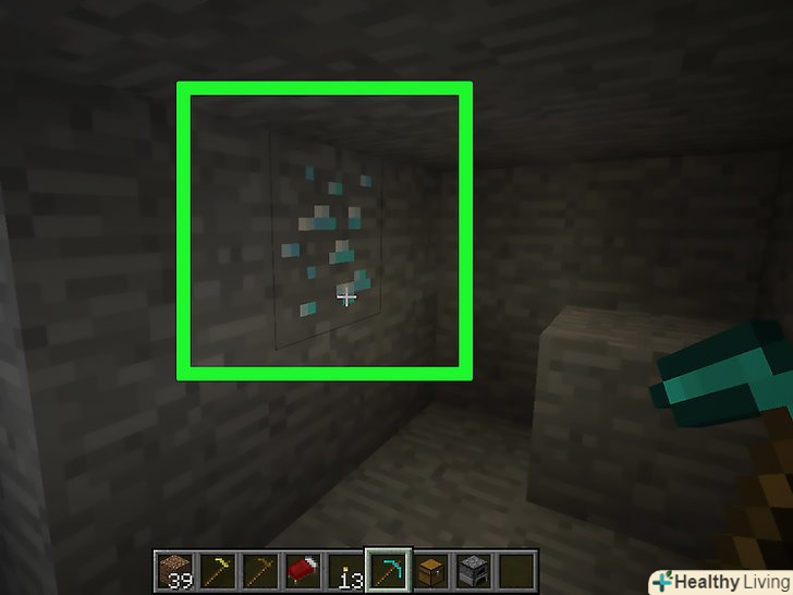 Копайте вниз до 16 рівня.алмази зустрічаються на рівні 5-16 (координата Y дорівнює від 5 до 16), але найбільше їх між 5 і 12 рівнем. Щоб дізнатися свою y-координату, відкрийте карту (на консолі і мобільному пристрої) або натисніть F3 (Windows) або Alt+Fn+F3 (Mac).[1]- Рекомендуємо копати зигзагоподібно, тому що копання по прямій може привести до падіння в печеру, кімнату для мобів (це кімната з 2 скринями, факелом і точкою відродження мобів) або навіть в лаву.