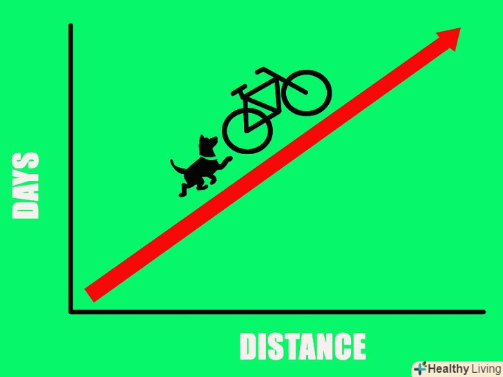 Починайте з повільної їзди на короткі дистанції. це дасть собаці час на звикання до правильної поведінки і до самого навантаження від вигулу на велосипеді. Після завершення навчання собаки вам необхідно почати повільно їздити з нею на велосипеді на невеликі відстані, витрачаючи на це не більше декількох хвилин. Переконайтеся в тому, що собака біжить поруч з вами лише легким бігом. Давайте їй при цьому частування і хваліть, щоб виробити позитивні асоціації з вигулом на велосипеді.