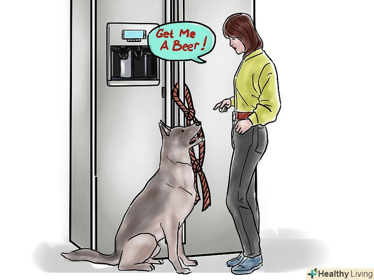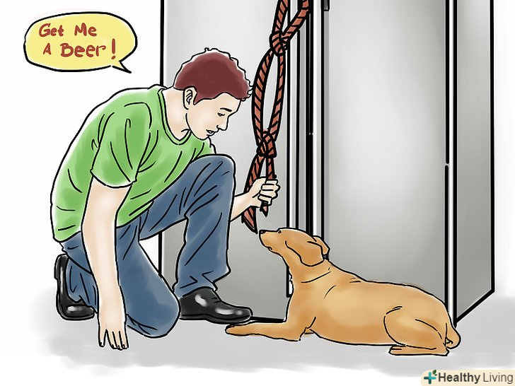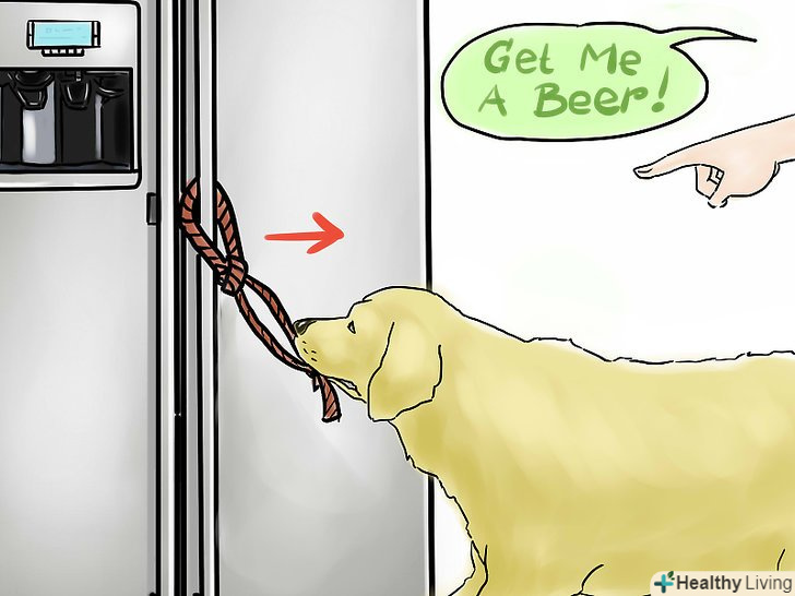 Вимовляйте "Принеси мені пива" щоб підштовхувати пса до кусання рушника. хваліть Його і давайте ласощі кожен раз, як собака потягне і відкриє холодильник.