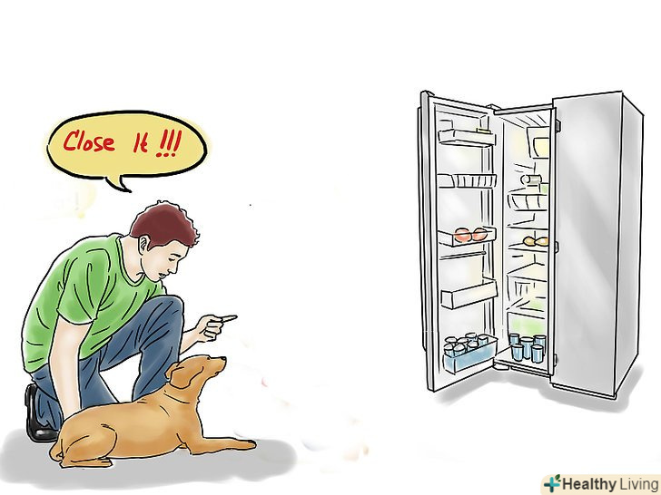 Відходьте далі, залишаючи холодильник відкритим. повторюйте собаці"Закрий". Нагороджуйте її кожен раз, як у неї буде виходити закрити двері.