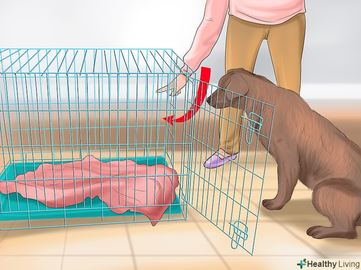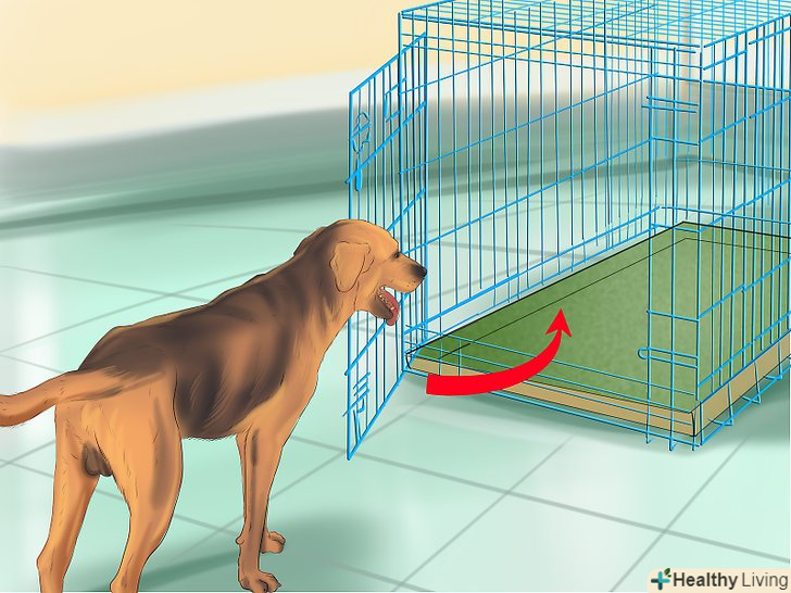 Заохочуйте собаку. Давайте ласощі, коли вона зайде в клітку. Закрийте двері і посидьте поруч кілька хвилин. Відкрийте двері, коли собака не буде скиглити.