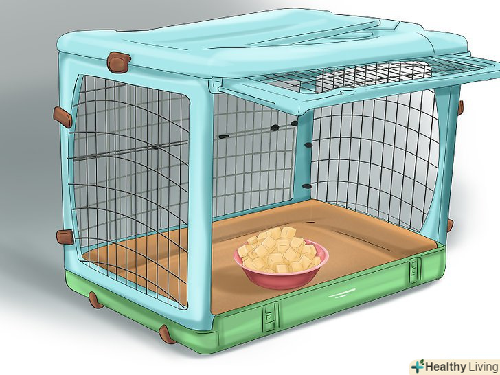 Покладіть в клітку ласощі. під час привчання собаки до клітки вам потрібно буде використовувати ласощі, щоб викликати у тварини приємні асоціації з цим місцем. Немає необхідності залишати воду і їжу в клітці. Здоровим собакам не потрібна вода вночі (тобто в найтриваліший період перебування в клітці), якщо тільки на вулиці не дуже жарко.