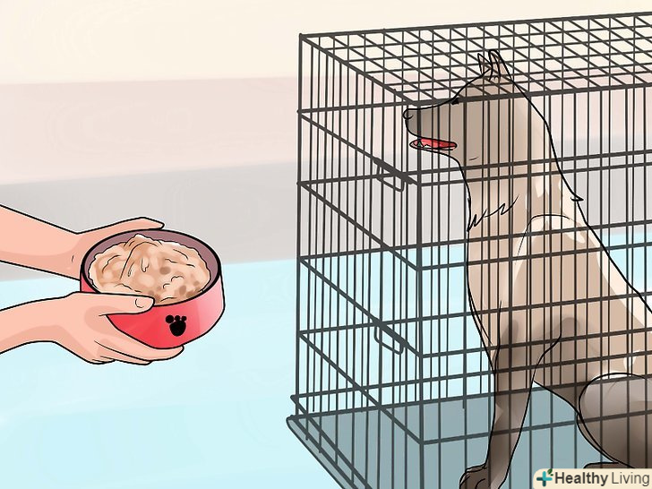 Почніть підкладати їжу собаці в клітку. як тільки ваш вихованець відчує себе комфортно і звикне до свого нового місця, можна почати годувати його в клітці. Це допоможе собаці звикнути до неї і сприймати її, як частину свого життя. [15]- Поки собака буде їсти, закрийте дверцята клітки. У перший раз найкраще відкрити дверцята ящика після того, як собака поїсть, щоб вона не злякалася. Згодом можна поступово збільшувати кількість часу, який собака буде проводити в клітці, додаючи кожен день по 1-2 хвилини. [16]