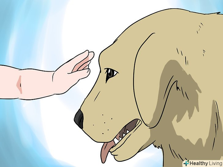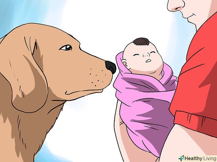 Акуратно уявіть дитину. сидіть тихо, тримайте дитину, а хтось інший нехай тримає собаку. Говоріть з собакою, в той час як хтось інший ходить з нею навколо дитини. Її повідець повинен бути коротким, але ослабленим, вона не повинна відчувати натягнутість.- Дозвольте собаці нюхати ноги дитини, але не дозволяйте підходити занадто близько. Похваліть її, якщо вона спокійно прийняла дитину.