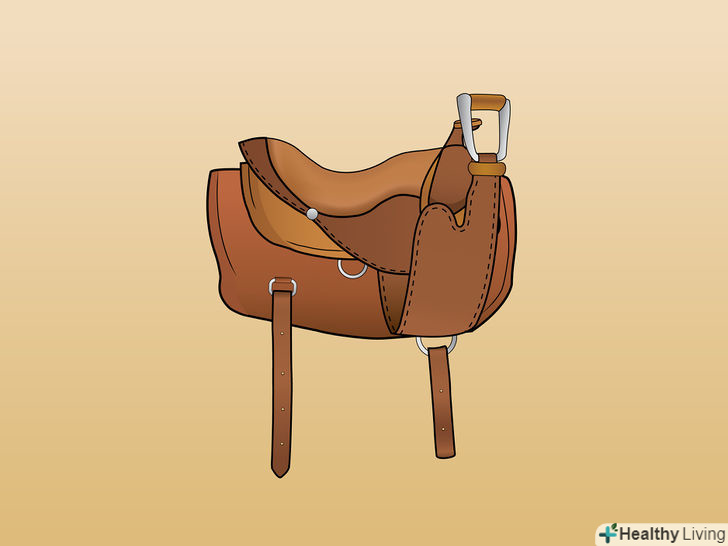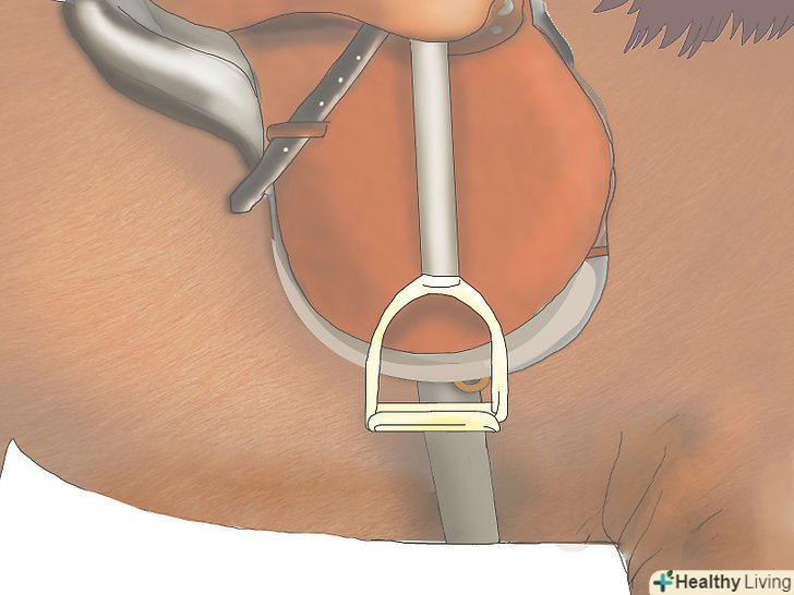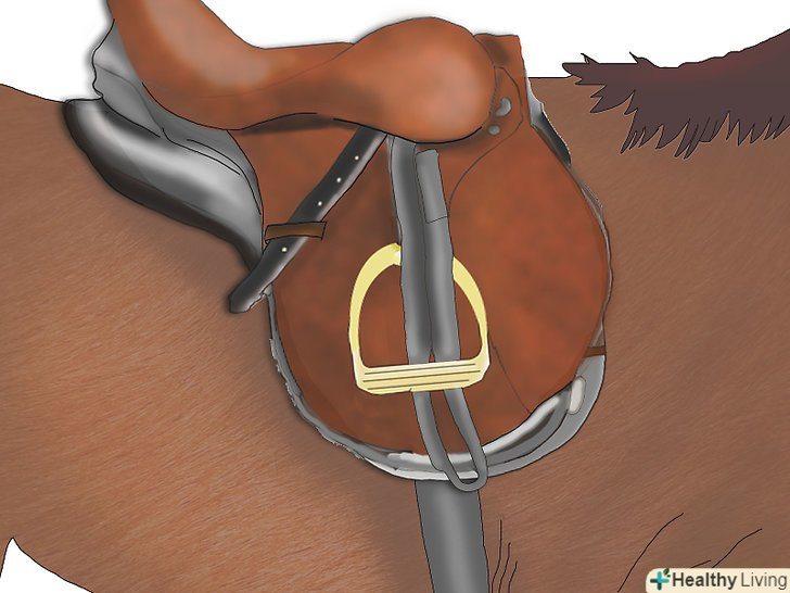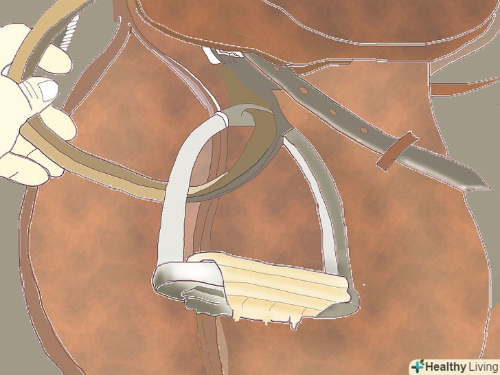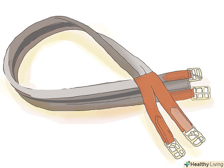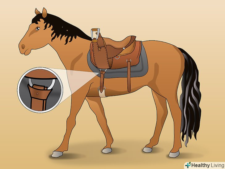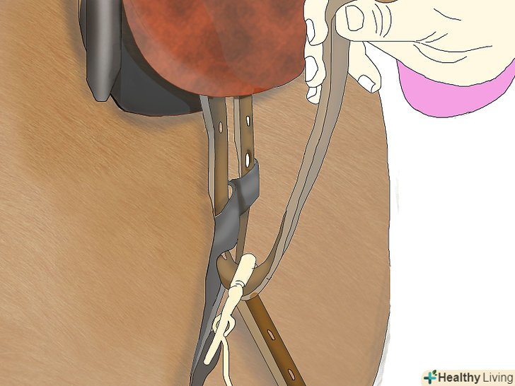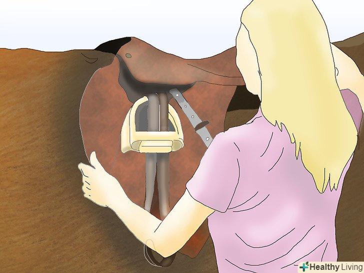 - Пристебніть передню (головну) підпругу. це ключовий крок. Ви не зможете кататися без підпруги. Обов'язково запам'ятайте, що підтягувати підпругу слід поступово ; ви ж не хочете поранити коня.