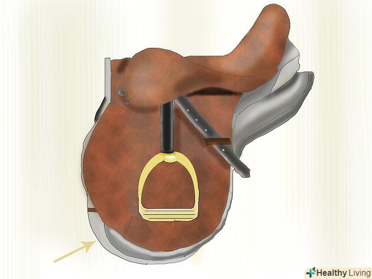 Приєднайте підпругу до пріструге справа, потім притягніть її вліво. вона повинна пройти знизу коня позаду передніх ніг. Якщо ви бачите проміжок між ліктем і подпругой, то сідло занадто далеко стягнуто назад.