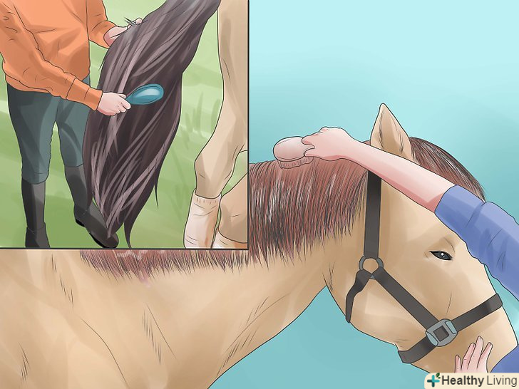 Дбайте про гриву і хвості вашої коні. Якщо грива і хвіст коня постійно не розчесані і повні сміття, то буде дуже важко підготувати їх до потрібного вигляду до показу. Очищайте гриву і хвіст вашої коні кожен раз, коли доглядаєте за ними, і втирайте масло какао хоча б один раз в кілька днів. Це буде діяти в якості кондиціонера, і зробить її волосся товщі і м'якше протягом довгого часу. При необхідності використовуйте шампунь, щоб допомогти скоротити кількість вузлів у волосі.- Заплітайте її гриву (коли літає багато мух) це не дає волоссю ще більше заплутуватися.