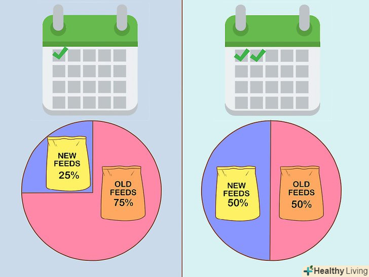 Вносьте зміни в дієту коня поступово. якщо вам необхідно змінити тип дається коні корму, не робіть це простим переходом на новий корм. Почніть із заміни 25% старого корму на новий. Через два дні вже замінюйте новим кормом 50% старого корму. Ще через два дні замінюйте 75% старого корму новим. Через чергові два дні ви зможете повністю перевести коня на новий корм.- На додаток до поступових змін дієти, ви повинні намагатися годувати коня приблизно в один і той же час кожен день. Коні краще себе почувають, якщо мають регулярний розклад годувань.
