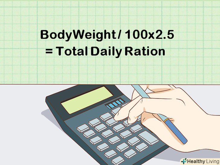 Розрахуйте загальну щоденну потребу Коня в харчуванні (в фуражі і концентраті). Кінь повинна вживати приблизно 1,5-3% від власної ваги, а в середньому близько 2,5%. Для визначення добової потреби коня в кормі використовуйте наступне рівняння: Вага коня / 100x2, 5=Загальний денний раціон