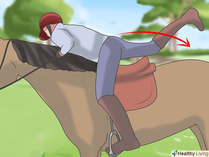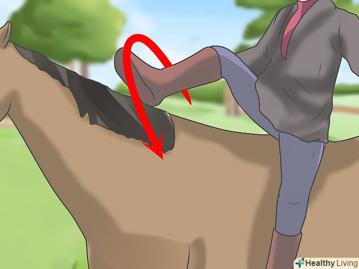 Перекиньте праву ногу через спину коня. нахиліть корпус вперед над передньою частиною сідла, а вільну праву ногу перекиньте на ліву сторону досить високо над крупом коня. Будьте обережні, не вдарте при цьому русі коня, так як вона може налякатися і почати йти, бігти або просто рухатися.- Коли завершите цей рух правою ногою, можете для балансу перемістити праву руку на задню частину сідла.