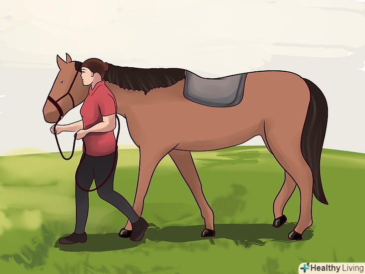 Ведіть коня. Так як ви весь цей час утримували поводи, тепер вам буде легше вести коня з землі. Перш ніж йти, підніміть стремена, щоб вони не билися об боки тварини і не чіплялися за перепони.