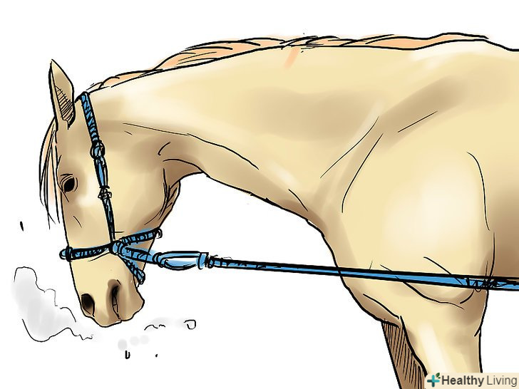 Використовуйте привід для імітації роботи в вуздечці. Кінь повинна звикнути до того, що поводи знаходяться навколо її шиї, а ви тягніть її морду назад за мотузку на недоуздке. Заведіть коня в круглий загін і змусьте стояти смирно. Тримайте Привід на відстані близько метра від недоуздка, а потім закиньте його на спину коня. Оберніть його кругом і посувайте по шиї вгору-вниз.- Якщо Кінь нервує або лякається, не дозволяйте їй втекти і не прибирайте мотузку. Замість цього продовжуйте рухати мотузку по шиї, поки кінь не заспокоїться і не перестане рухатися. Потім зніміть мотузку.