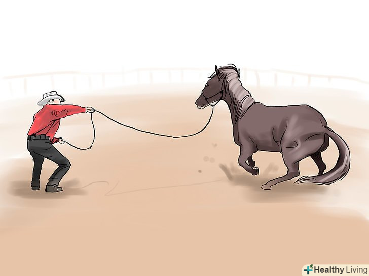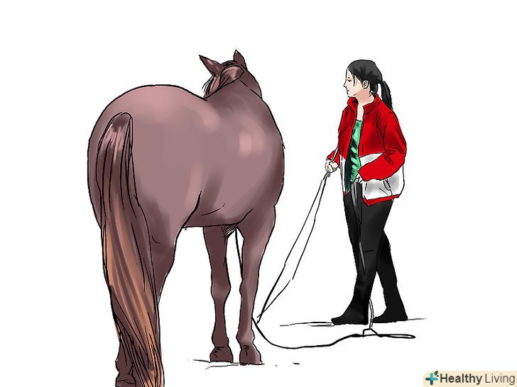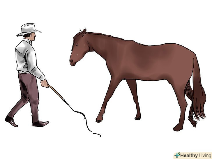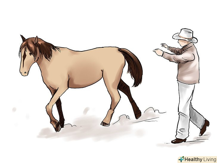 Водіння коня на приводі з різною швидкістю. це дозволяє зробити відразу кілька речей: кінь фокусується на вас і подаються вами сигналах, при цьому звільняється надлишок енергії та адреналіну, а також закріплюються умовні сигнали. Почніть вести коня по колу навколо вас на поводі довжиною близько півметра. Через кілька хвилин прискорте коня до рисі, одночасно цокаючи і поплескуючи її по крупу вільним кінцем приводу.- Якщо Кінь не реагує, цокніть і докладіть більше зусиль на її круп.