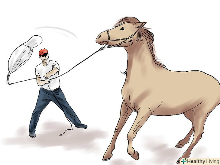 Привчіть коня не боятися. Десенсибілізуйте коня до руху 'лякаючих' речей. Використовуйте довгий прут або палицю і прикріпіть до кінця пластиковий пакет. Помахайте їм в повітрі поблизу коня, вона, ймовірно, налякається або почне хвилюватися. Коли кінь злякається, продовжуйте розмахувати пакетом, поки вона не зрозуміє, що це не небезпечно і не заспокоїться. Потім приберіть пакет і прут, приголубити і похваліть коня.- Продовжуйте процес, поки не зможете терти пакетом всю коня. Запам'ятайте ніколи не прибирати пакета, поки кінь налякана, прибирайте його тільки тоді, коли вона спокійна.