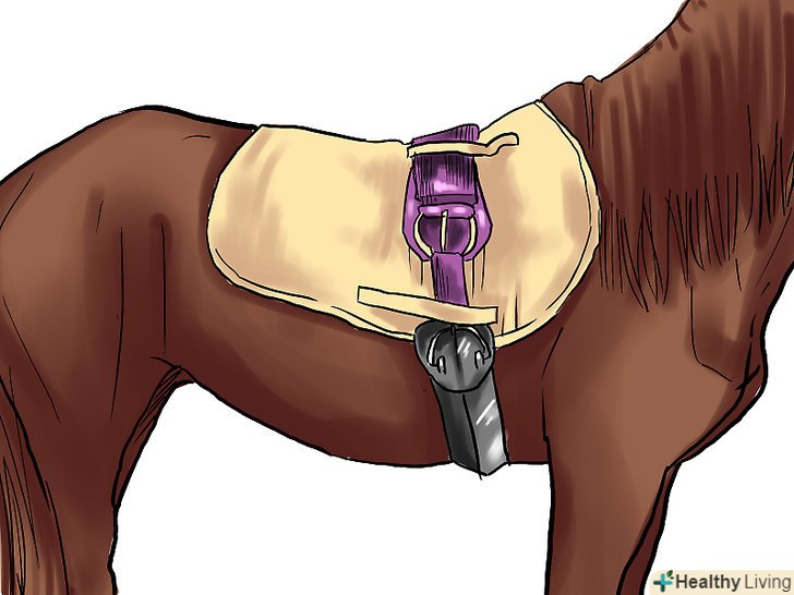 Запрягіть підпругу. наступним кроком є кріплення підпруги для їзди без сідла, яка складається безпосередньо з подруги, що охоплює тіло коня і ріжка-ручки. Це дає відчуття сідла без всієї ваги і навантаження. Після того, як кінь буде запряжена подпругой, поводите її по колу на поводі. Через кілька хвилин дайте команду до рисі, а потім легкому галопу.- Запрягайте коня подпругой кілька разів протягом тижня або двох перед переходом до сідла, щоб кінь дійсно відчувала себе комфортно з чимось пов'язаним у неї на спині.