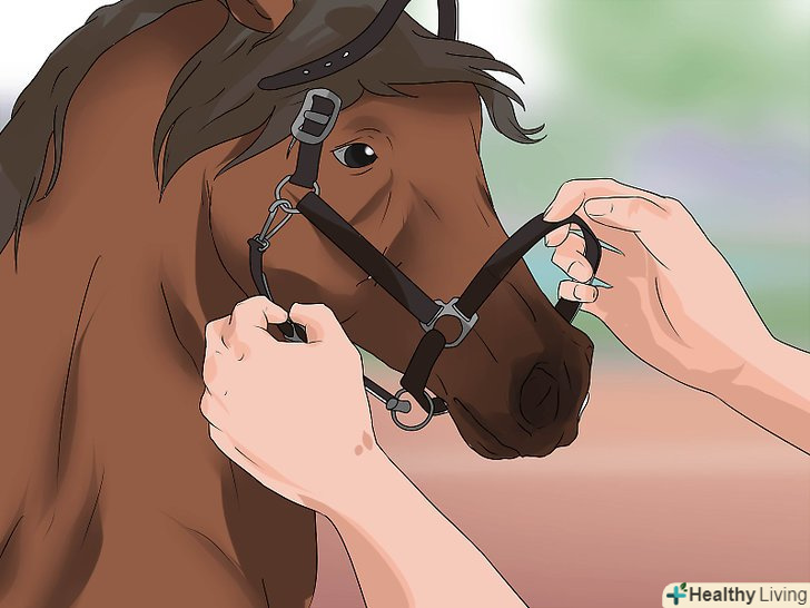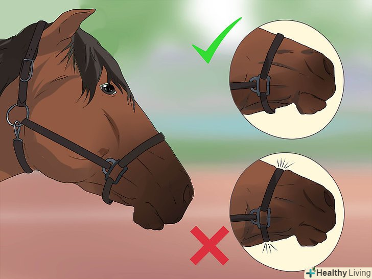 Переконайтеся в тому, що недоуздок добре відрегульований за розміром. Недоуздок повинен добре сидіти на голові коня. Невідповідний недоуздок здатний заподіяти тварині біль. Якщо недоуздок врізається коні в шкіру або шерсть, його розмір необхідно відрегулювати пряжкою на суголовном ремені. Однак майте на увазі, що іноді недоуздок може бути просто малим. Якщо перестібання старого недоуздка на його максимальний розмір не допомогло, вам буде потрібно відвідати магазин кінного спорядження і придбати новий недоуздок більшого розміру. [9]- Для визначення правильного розміру недоуздка можна виміряти голову коня. Візьміть сантиметрову стрічку і прикладіть її кінець збоку на рівні виступаючої кісточки вилиці і приблизно посередині між оком і ніздрів. Потім проведіть стрічку зверху по носі коня до такої ж точки з іншого боку. Запишіть мірку. Це необхідний Вам розмір намордного ременя (капсуля). Якщо Кінь погано реагує на сантиметрову стрічку, прикладіть їй до морди мотузку, а потім виміряйте мотузку. [10]