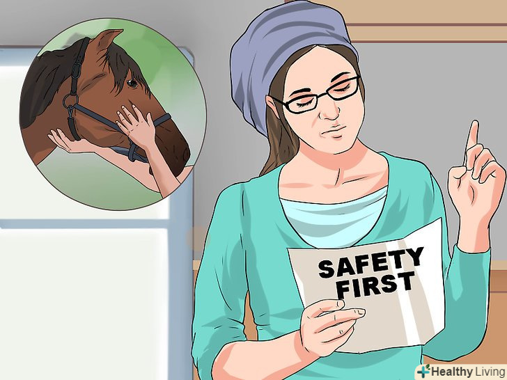 Дотримуйтесь базових правил безпеки. існує кілька базових правил безпеки, яких слід дотримуватися при надяганні недоуздка на коня. По-перше, необхідно подбати про безпеку коня.- Ніколи не дозволяйте коні вільно бігати з надітим на неї недоуздком. Недоуздок може зачепитися за гілку дерева або огорожу і стати причиною травми.
