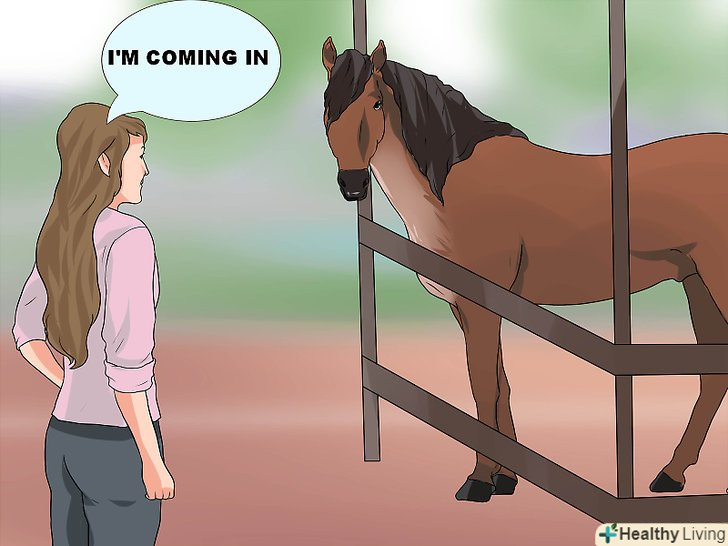 Покличте коня. наближаючись до коня, покличте її. Це дозволить вам попередити тварину про свою появу. Зверніться до коня по кличці або просто скажіть що «небудь на зразок " Я йду!", щоб вона знала, що ви заходите до неї в загін або в стійло.