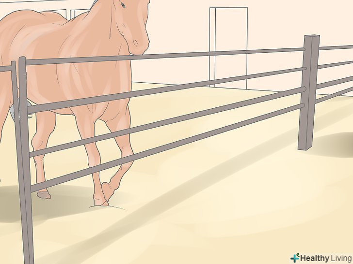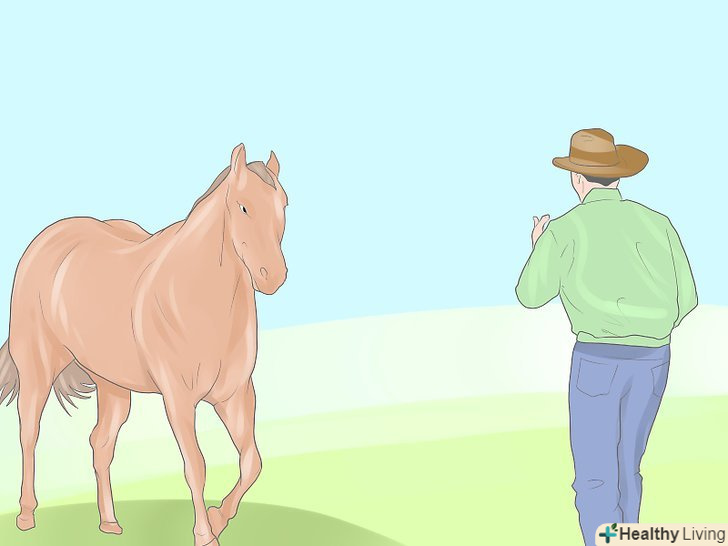 - Випустіть коня в невеликий круглий загін (підійде і загін прямокутної форми, але круглий все ж зручніше). Займіть домінуючу позицію в центрі загону; повернувшись обличчям до коня, розпрямивши плечі і дивлячись прямо на неї, заохочуйте її до руху риссю або легким галопом по периметру загону. У разі необхідності використовуйте мотузку або батіг, поклацуючи їм, щоб тварина почала скакати навколо вас. Коли Кінь зробить три або чотири кола, розгорніть її в іншу сторону. Продовжуйте, поки не побачите ознак того, що кінь відчула єднання з вами.