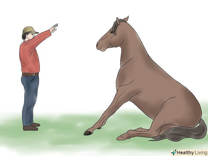Попросіть коня встати. використовуйте інше ключове слово, наприклад вгору , або якийсь інший, щоб попросити її сісти, а потім встати. Коли ви говорите це нове слово, говорите його позитивним енергійним тоном. Приблизно так, як ніби ви пускаєте ледачого коня галопом на Корді.