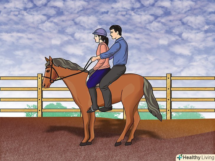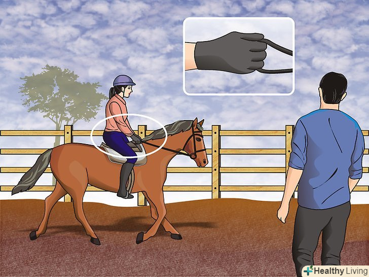 Нехай помічник керує конем в рисі. ваш помічник повинен почати робити перехід коня з ходу на рись і в той час як ви будете звикати до неї. Послабте поводи і утримуйтеся в сідлі.