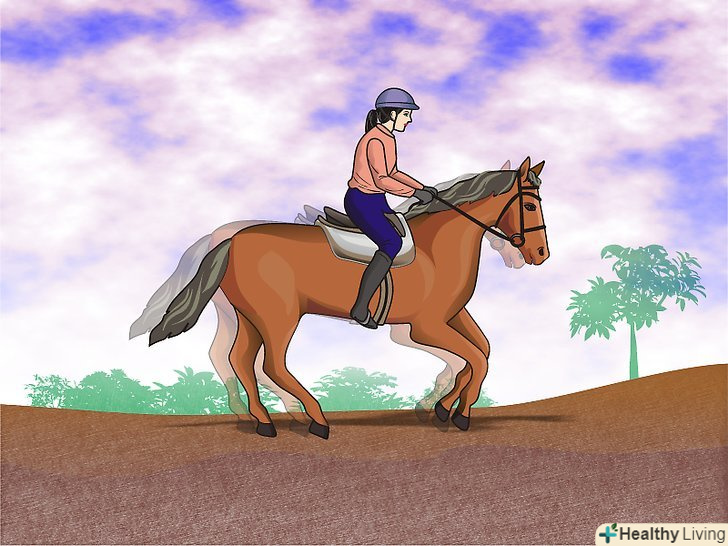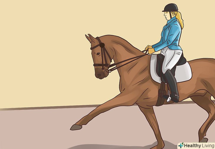 Стисніть обидві ноги на своєму коні з трохи більш твердим тиском на внутрішній ділянку (якщо ви стискаєте зовнішню ділянку сильніше, це - засіб для легкого галопу). якщо Кінь не відповідає, торкніться його злегка своїм батогом. Намагайтеся не бити коня, тому що це тільки робить її млявою.- Стисніть щільно ногами і дайте коні кілька ударів, поки не зможете відчути, що входите в ритм«1, 2, 1, 2».