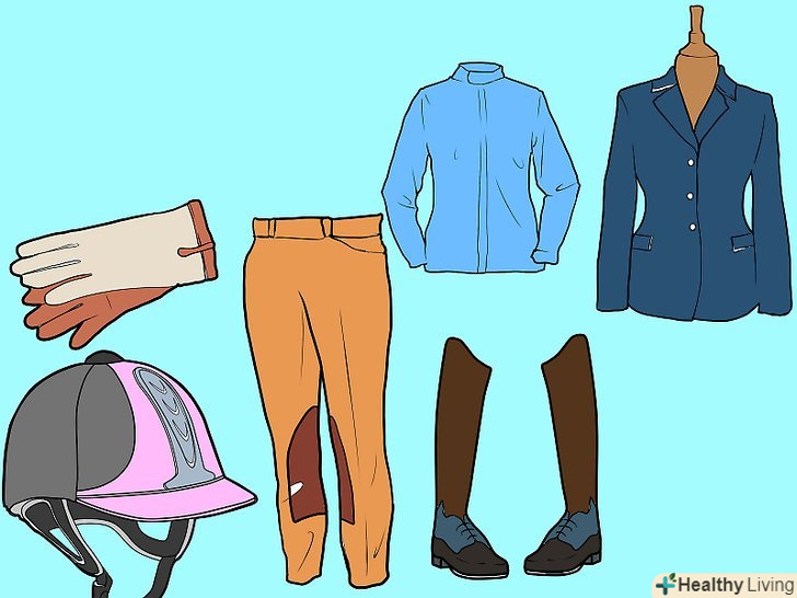 Вибирайте безпечний одяг для верхової їзди: чоботи з плоскою підошвою і шпорами, щоб ви випадково не заплуталися в стремена коня (якщо таке станеться і ви випадково впадете з коня, це може мати фатальний результат для вас), захисний шолом, довгі штани, як джинси або джодпури, рукавички для верхової їзди, спеціальні безпечні поводи, напівкожані штани, щоб залишатися в сідлі, і захисний жилет, щоб оберегти ваші органи і кістки.