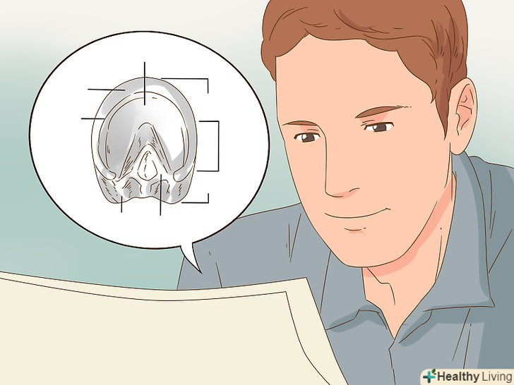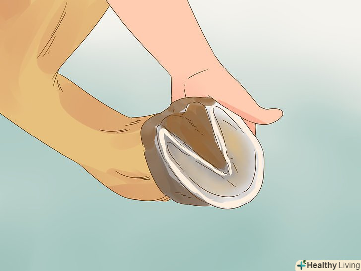 Перевірте зовнішній вигляд копита. після очищення, обрізки і вирівнювання копита ще раз огляньте його. Це буде остаточна перевірка, яка допоможе вам переконатися в тому, що всі проблемні зони оброблені, копито повністю розчищено і Кінь рівно стоїть на ньому. [10]- Перевірте симетрію копита.