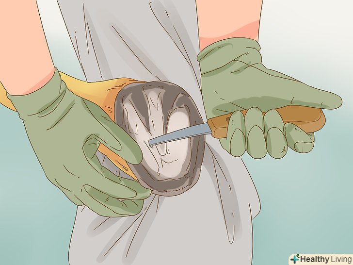 Очистіть копита від бруду. перш ніж починати обрізку копит, їх слід почистити. Це дозволить вам краще розглянути рогові тканини і дасть зрозуміти, які ділянки копита вимагають особливої уваги. Скористайтеся копитним ножем, щоб видалити грунт та інші забруднення, які могли забитися в копита. [3]- Тримайте копитний ніж в руці кінчиком леза вниз, а не так, як ви зазвичай тримаєте кухонний ніж.