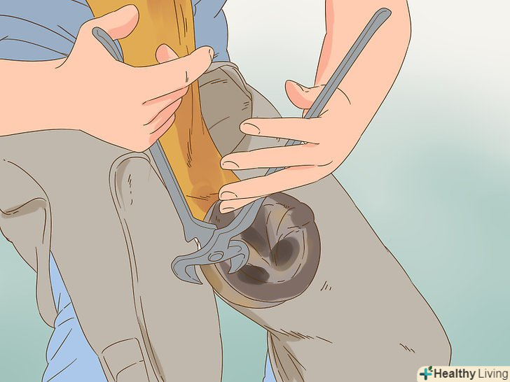 Обріжте копито. для обрізки копита будуть потрібні копитні кліщі. Вони є великим аналогом кусачок для нігтів, призначеним для кінських копит. Кліщами вкорочують зайву довжину копитної стінки. Вони добре допомагають швидко видалити відросли частини копита і грубо надати копиту правильні обриси перед остаточною обробкою інших зон. [7]- Використовуйте кліщі для видалення будь-яких сильно відросли зон зовнішньої стінки копита.