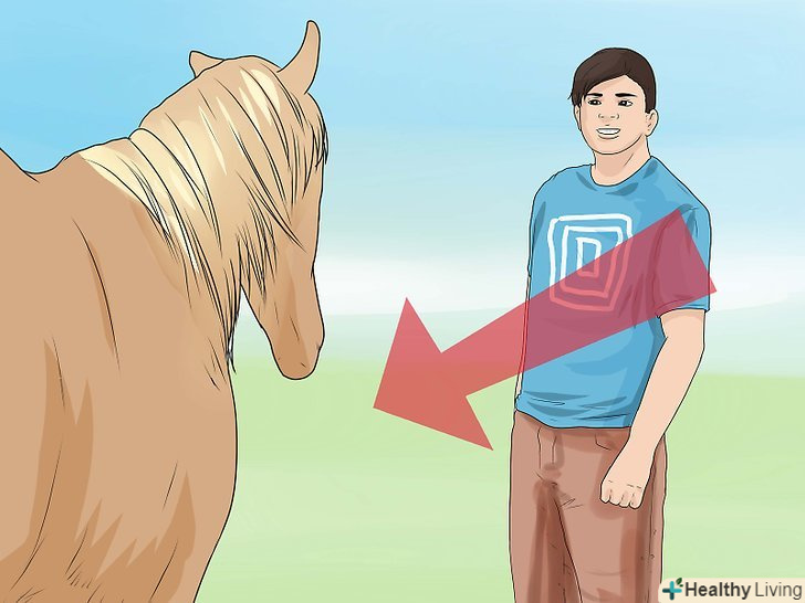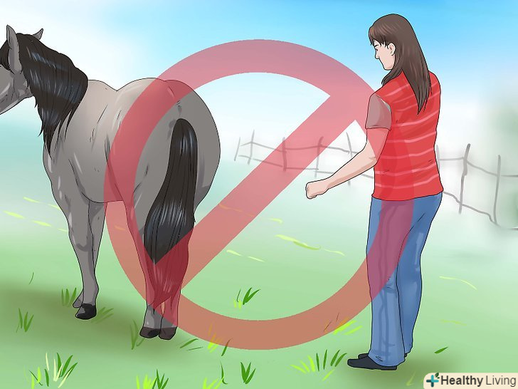 Не заходьте в зону удару задніх копит. незалежно вашого досвіду в спілкуванні з кіньми, завжди існує деяка ймовірність того, що щось вам непідконтрольне налякає кінь. У такій ситуації вам зовсім не захочеться опинитися в зоні ураження від удару надзвичайно сильних задніх копит. Зазвичай ця умова виконують одним з двох нижчевказаних способів.- У першому випадку людина залишається на шанобливій відстані ззаду або збоку коня. Залежно від розмірів коня, "Безпечна відстань" може варіюватися, тому Ви повинні забезпечити тварині достатньо вільного місця, особливо якщо перебуваєте позаду.