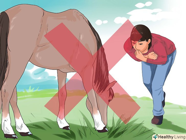 - Тримайтеся подалі від сліпих зон коня. Сюди відноситься зона прямо перед мордою, під головою, під животом і ззаду коня. [11] якщо вам необхідно переміститися в одну з таких зон, переконайтеся в тому, що кінь розуміє, де саме ви знаходитесь. Розмовляйте з нею ласкавим голосом і підтримуйте контакт дотиком однієї руки.